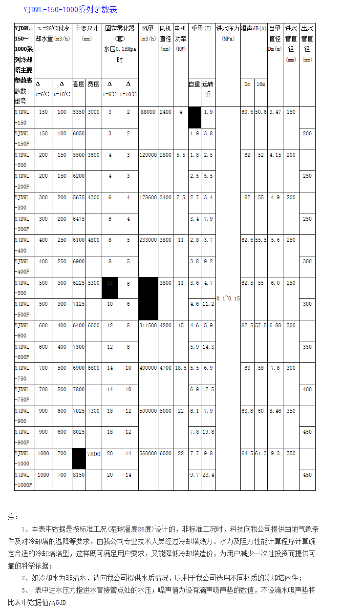 1、標(biāo)準(zhǔn)工況一般條件可按此樣本選型,非標(biāo)準(zhǔn)工況時(shí),科技向我公司提供當(dāng)?shù)貧庀髼l件(或塔所處的地理位置)及對(duì)冷卻塔的特殊要求,由我公司技術(shù)人員經(jīng)過(guò)冷卻塔熱力及阻力性能計(jì)算程序計(jì)算確定。