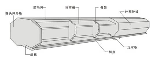 注:風荷載為1200Pa屋頂通風器每L3米組成一個單元,所以完整的屋頂通風器由兩個端頭單元和若干個中間單元組成,電源380V/3/50Hz