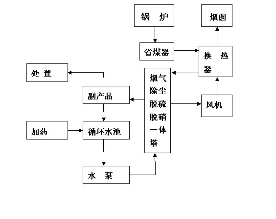 本方案設(shè)計(jì)流程:煙氣→余熱回收裝置(省煤器)→換熱器→除塵脫硫脫硝一體塔→換熱器→排放。(本流程僅供參考,我公司根據(jù)不同情況設(shè)計(jì)不同方案,但均以處理達(dá)標(biāo)、投資小、占地面積小、管理方便為宗旨)